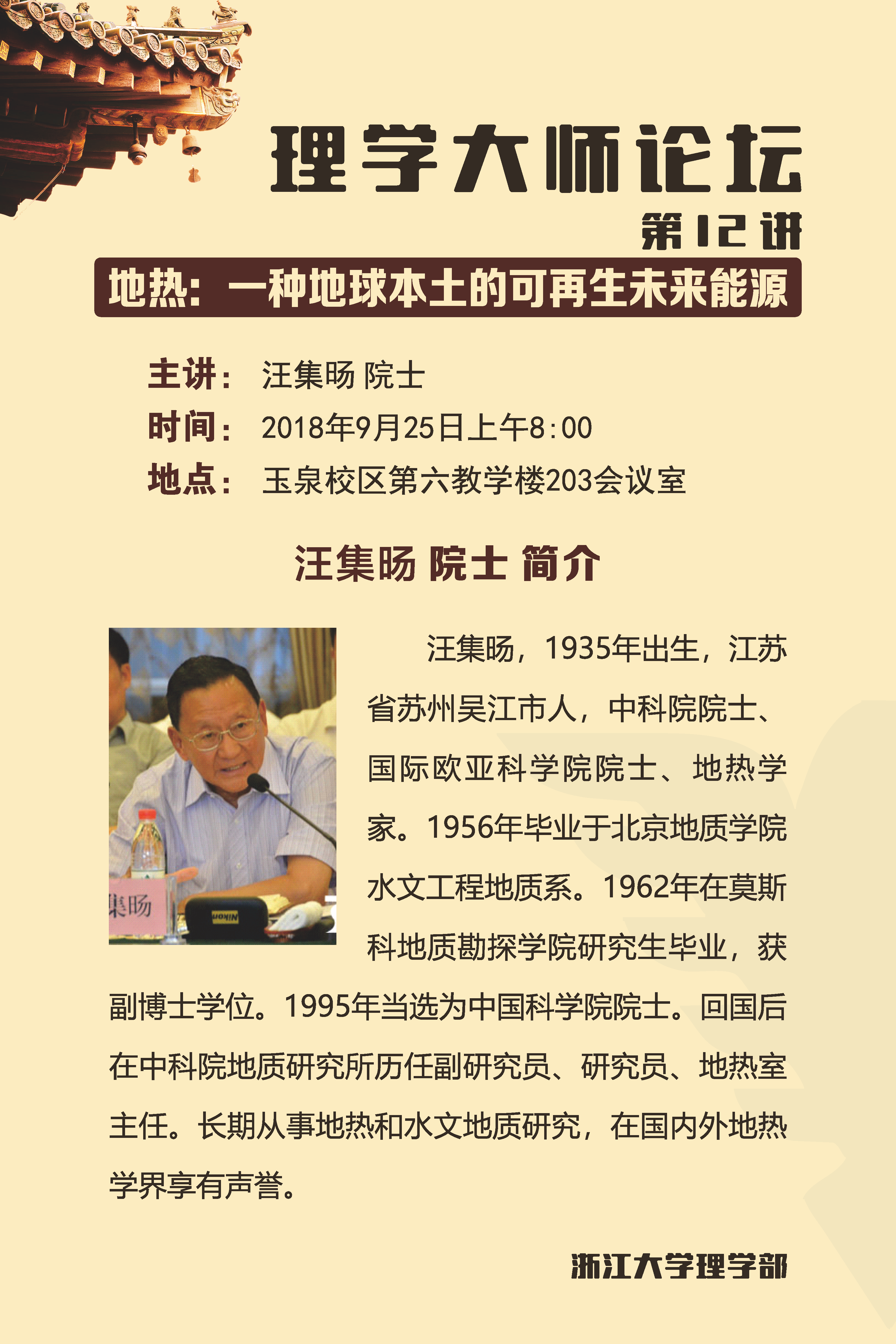“理学大师论坛”第十二讲――汪集�院士:地热:一种地球本土的可再生未来能源